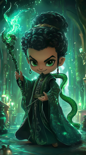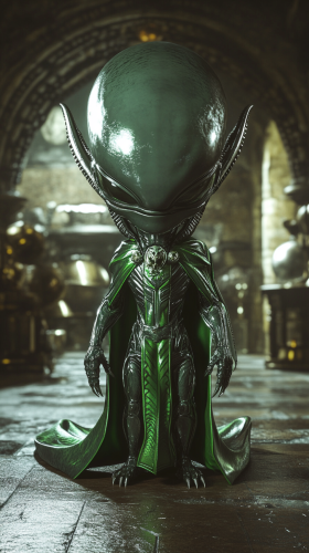 A chibi-style alien from the Alien film series, dressed in Slytherin robes with green and silver accents. The alien has a sleek, menacing look with serpentine features and a cunning expression. It’s posed in a dark, mysterious corner of the Slytherin common room, surrounded by green and silver decorations and magical artifacts, reflecting the house’s ambition and resourcefulness. High quality, 8k resolution. --ar 9:16