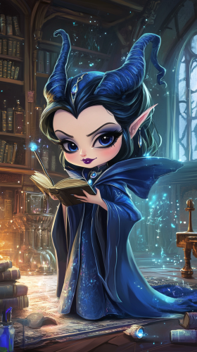 Chibi Maleficent in Ravenclaw robes, studying magical texts.