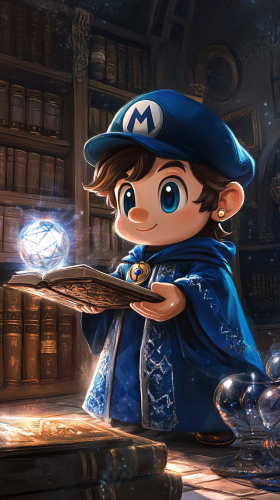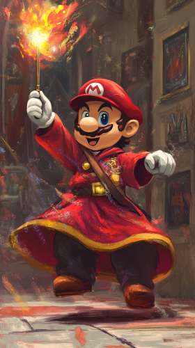 A chibi-style Mario from Super Mario dressed in Gryffindor robes, holding a wand in one hand. Mario is casting a playful spell with a burst of colorful magic, either practicing a spell in the Gryffindor common room or having fun on a Quidditch pitch. The scene is vibrant with red and gold Gryffindor decorations, and Mario’s characteristic enthusiasm and bravery add a dynamic touch to the magical setting High quality, 8k resolution. --ar 9:16