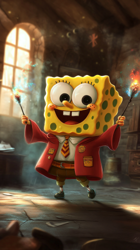 A chibi-style SpongeBob SquarePants dressed as a Gryffindor student. SpongeBob is wearing red and gold Gryffindor robes and is joyfully participating in a magical duel with a wand, creating playful and colorful spell effects. The scene is set in a Gryffindor common room or a magical classroom, with a fun and energetic atmosphere reflecting SpongeBob’s cheerful personality. High quality, 8k resolution. --ar 9:16