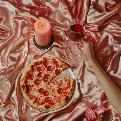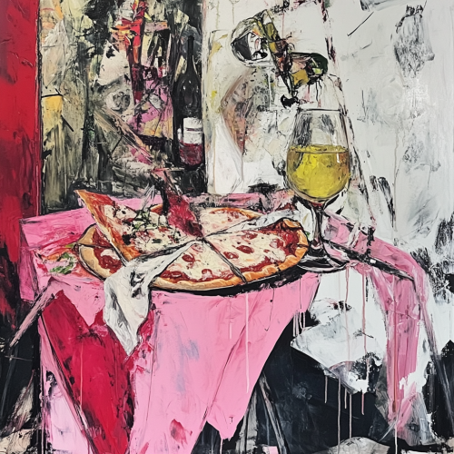 a basquait abstract painting style of a table with a draped cloth and a realistic images of pizza and a glass of wine holded by a hand with pink and white and red colors and black and white elements, mixed realism and abstract, look up from 3/4 view with the image covered by the drape as table