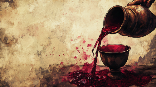 ancient bronze cup being poured into and it's contents running over with red wine and spilling on to an old table, line art, minimalist, water colors --ar 16:9