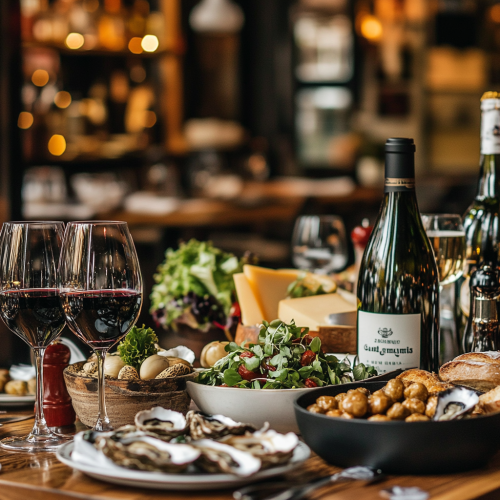 a restaurant table filled with the following products bottles of wine, bottles of beer, salads, bitterballen, Oysters, nuts, glasses and plates, bread, cheeses
