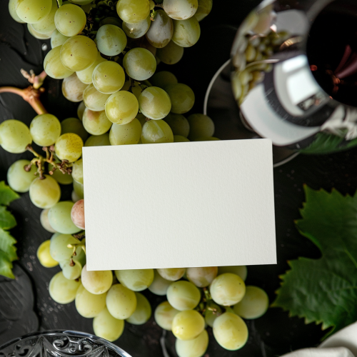empty, blank card, flat lay, on a bouquet of grapes and wine glasses, photo-realistic