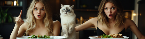 A split-screen photo of couture model Elizabeth Olsen, a blue-eyed blonde-haired woman, wearing a black dress and pointing at her food tray, next to her brown-haired friend on the other side. An angry white cat is standing on top of the table in the background. The left frame shows their excited faces as they open up two delicious plates with fresh green salad inside plastic takeout containers from an eco-friendly restaurant. --ar 128:35