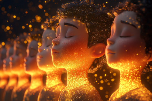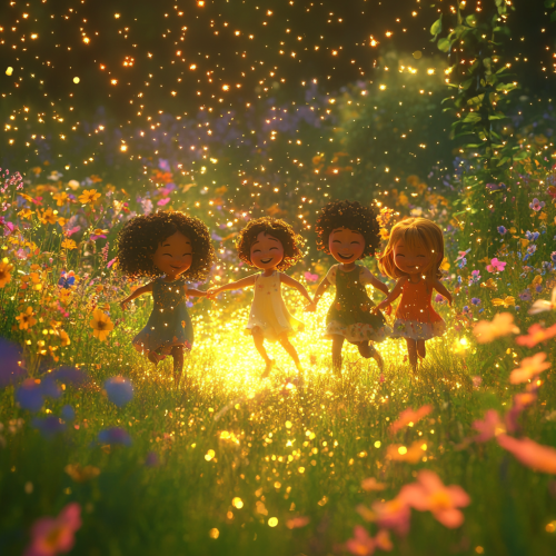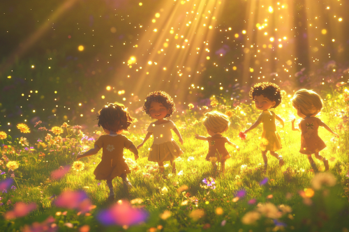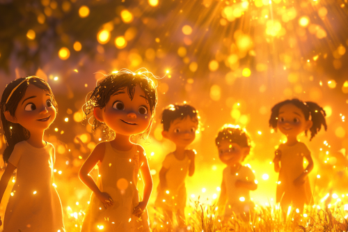 3d CGI animated image of A glowing field of children shimmering with light, their bodies filled with love, joy, and wonder, under a golden sky, very detailed, bright colors, childrens book image, cinematic lighting, --ar 4:5