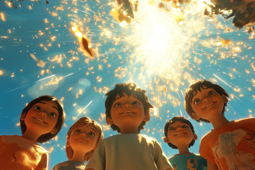 3d CG animation image of childeren, different ethnicities, outside, beams of golden light radiating from a blue sky, when it hits the childred it makes their bodies glow and shimmer with golden light, very detailed, colorful, bright, childrens book image, cinematic lighting. --ar 3:2