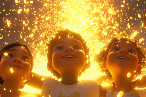 3d CG animation, Pixar style image of childeren, different ethnicities, outside, golden light is coming down from the sky, filling their bodies with glowing and shimmering golden light, very detailed, colorful, bright, childrens book image, cinematic lighting. --ar 3:2