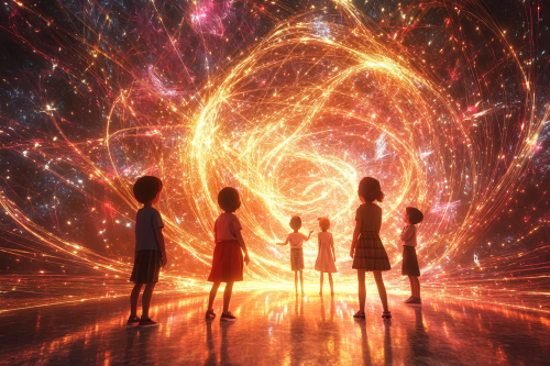 3d CGI animated image of children standing in a circle, watching their individual threads of light grow and intertwine with others, creating a beautiful network of glowing lines, very detailed, bright colors, childrens book image, cinematic lighting, --ar 3:2