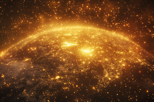 3d CGI animated image of a magnificent golden blanket of light covering the Earth, woven from the glowing threads of each child's light, wrapping the planet in warmth, very detailed, bright colors, childrens book image, cinematic lighting, --ar 3:2