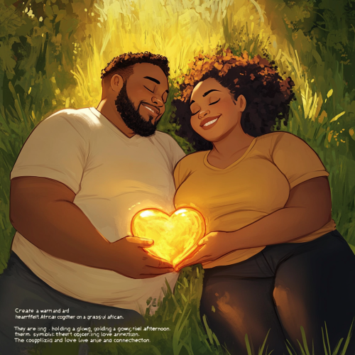 "Create a warm and heartfelt scene of an plus-sized African American couple lying together on a grassy field during a peaceful afternoon. They are holding a glowing, golden heart-shaped object between them, symbolizing their love and connection. The couple has relaxed and content expressions, enjoying the serenity of the moment. Their clothing is casual and comfortable, with the soft sunlight filtering through the trees, adding a gentle warmth to the scene. Surround them with soft shadows, subtle highlights, and a tranquil environment to enhance the emotional depth and intimacy of the scene." Realistic cartoon