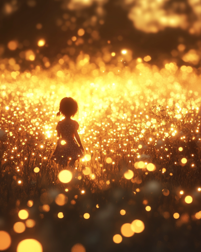 3d CGI animated image of A glowing field of children shimmering with light, their bodies filled with love, joy, and wonder, under a golden sky, very detailed, bright colors, childrens book image, cinematic lighting, --ar 4:5