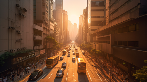 A modern urban cityscape at sunset, a bustling metropolis with towering skyscrapers, golden sunlight reflecting off glass facades, busy streets filled with people and vehicles, capturing the dynamic energy of the city, Photography, DSLR with a wide-angle lens (24mm), f/8 aperture, --ar 16:9 --v 5