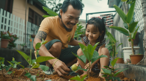 Vibrant Fujifilm Instax Mini photo of filipino young dad and daughter planting guava seeds together in a city home. She is intrigued and gasp with wonder, laughter, and a sense of reclaimed freedom. modern, trendy, urban. --v 6.0 --style raw --ar 16:9