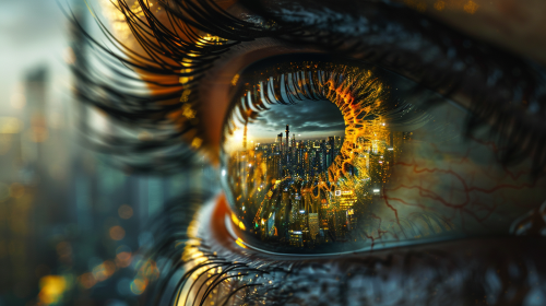 Macro shot of an eye with a futuristic augmented reality lens, reflecting skyscrapers at dawn, vibrant city awakening, intimate glimpse into advanced technology, surreal merge of human and machine, soft morning light enhancing intricate details, shadows playing across the urban silhouette. captured for hyper-realistic educational experiences with Niji 6, using Sony Venice and Cooke lenses, --ar 16:9 --chaos 8 --v 6.0 --stylize 300