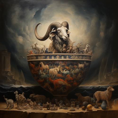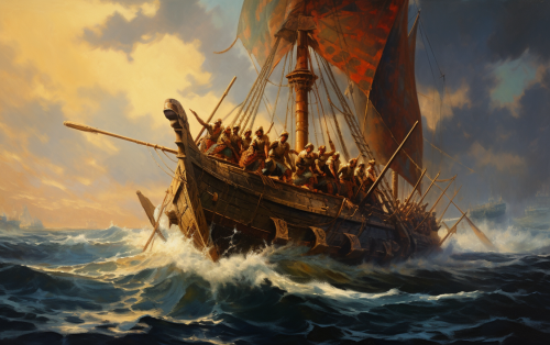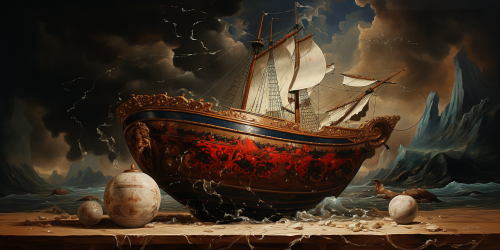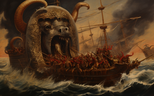 Ancient oil painting with Greek trier vessel rams the nose of a Persian vessel during a naval battle. --ar 16:10
