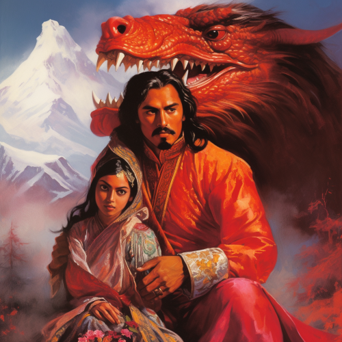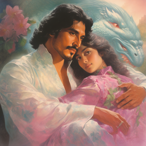 SUBJECT: Azhdahak the Man Dragon, STYLE: Mills and Boon Cover, 1980, pastel tones