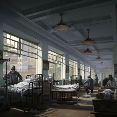 In the infirmary of the burned-out abandoned ship, a dead crew member was lying on a hospital bed, "full of tubes inserted into his body connected to the machines on the side." There was a huge terrifying head in a huge glass sculpture vessel beside him. Wearing full armor and wearing a Marine with a gun, the scene is gloomy and terrifying, with cinematic Rembrandt lighting, movie stills, shot with ARRI cameras, and a horror movie atmosphere --ar 16:9 --q 2 --seed 594234596