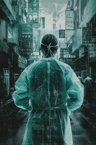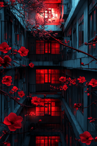 Movie poster, red and black color scheme, high contrast, symmetrical composition, Chinese hospital background, night scene, mysterious atmosphere, flowers blooming in dark buildings, modern urban style, red tone, high saturation. --ar 2:3