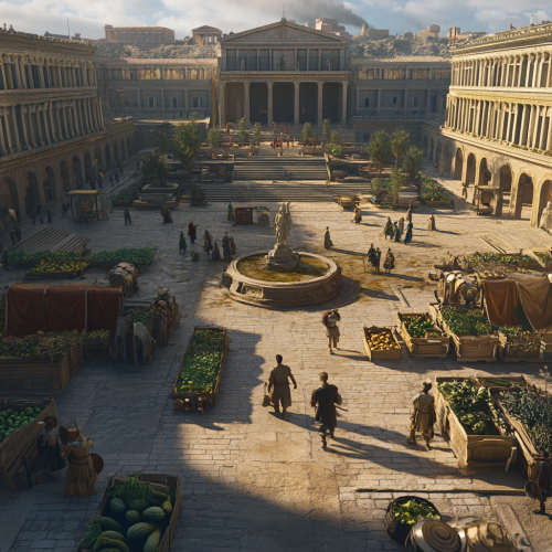A day in the Greek Empire. The center of the city - the emperor crosses a large square with his friends. Around the square are magnificent government buildings, water fountains and several vendors selling vegetables on the street corners. Cinematic lighting. Super realistic. --s 50