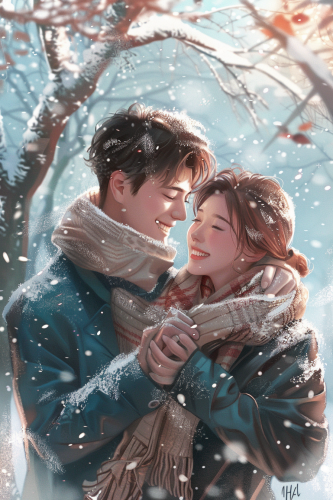 realistic couple, realistic, A couple wrapped in thick, cozy scarves and jackets, walking through a snow-covered park. The trees are dusted with snow, and soft snowflakes are falling all around. They are laughing and playfully throwing snowballs, their cheeks rosy from the cold, but their smiles warm and full of love. --v 6.0 --ar 2:3