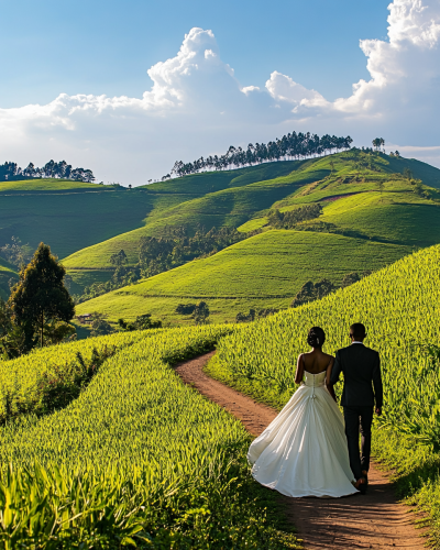 imagine hyper realistic 8k photography of a luxury rwandan bride and groom walking down the green hills that look like farms and blue sky, bride wearing a luxury dress --ar 4:5 --v 6.1