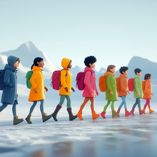 a bright Pixar-style image of a diverse group of teenagers walking in a single file line in Antarctica. The background is a flat, barren ground covered in snow.