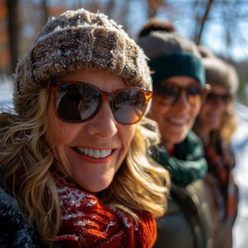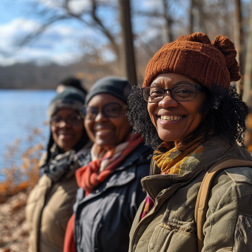 fun fitness walk with 15 -20 people of various ethnicities within in the Collierville. TN community in the park surrounding Johnson Lake. Smiling faces. Cool January day. Bright scene. Viewed from 20 feet away. --c 5 --v 6.0 --s 500