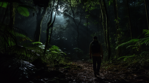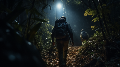 tourist night exploration walk through the jungle, with flashlight, Cuyabeno National Park, ultra realistic canon R6 35MM 2.8 --ar 16:9 --v 5.2
