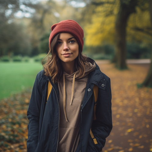 a photographic picture of an unpretentious, down to earth, uncomplicated, sensitive, reliable, not flashy, wearing casual or comfortable clothing style. They are located in a park in London, UK walking. 35mm dslr, f/1.4, bright natural lights