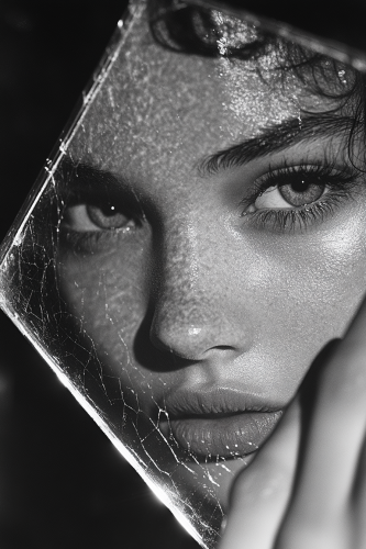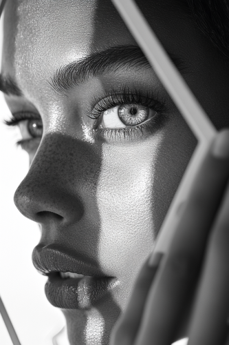 A hand holding a hexagon-shaped piece of paper with the face of a young woman in black and white. The reflection in her eye is distorted by a distortion effect. --ar 2:3 --style raw --stylize 750 --v 6.1