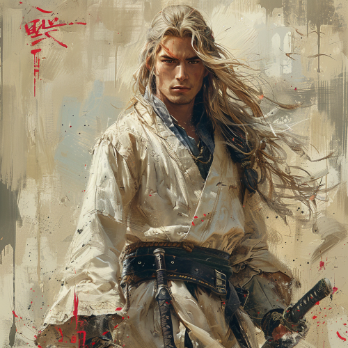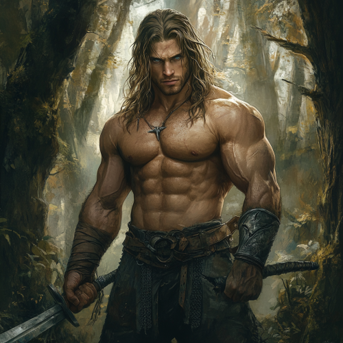 Character art, Fantasy setting, gritty, A wood elf swords man stands his muscles flex with readiness as he stands casual in a wooded forest backdrop. He has a young face with Blue eyes and long hair. He has a mysterious look to him