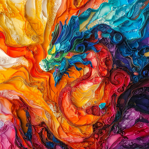 Chinese zodiac-inspired artwork, vibrant fluid painting background, alcohol ink origami, intricate paper cutouts of the 12 zodiac animals, abstract flow art, colorful, layered textures, delicate and dynamic composition, 3D paper effect, fine detail in paper folds, bright and expressive colors