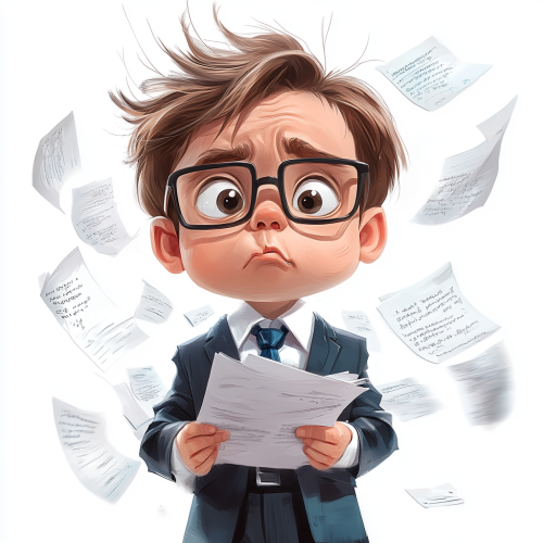 illustration of cute kid in a suit with specs...holding and paper lookind at finance and acting confused , white background, zoomed, words floating around him
