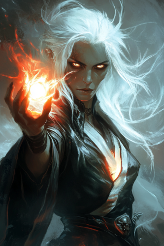 a dark complexioned sorceress with white hair and eyes wearing a robe that is half black and half white holding up a glowing talisman, in the style of a grim dark fantasy painting --ar 2:3