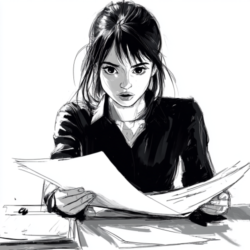 film storyboard, modern office girl sitting at desk holding very long paper document suprised, sketch, white background studio, soft, black and white, front portrait --v 6.1