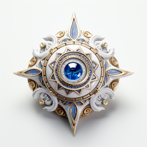 macro photography of a blue and white evil eye talisman on a white background, product view, eye level, white background, product display, centered image, incredible detail, ornate, 3D shading, universal lighting, high nobility, unreal engine, photo realistic, ultra realistic, detailed, in the style of dungeons and dragons, fantasy art aesthetic, in the style of mystic mechanisms, gradient packaging