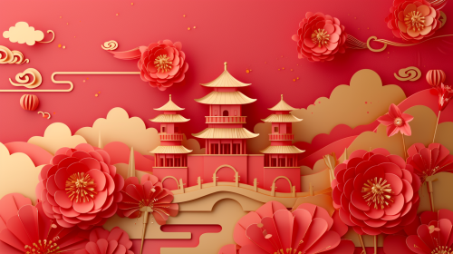 Multi-dimensional paper kirigami craft, with Chinese traditional buildings and landscape,symmetric composition, clean background, red and golden color, bright light, clouds and flowers --ar 16:9 --v 6.0