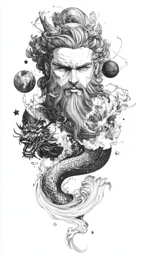 Tattoo sketch: Zeus head, Chinese dragon, planets, stars, wave. Symbols of wealth and success. Style: Chinese tattoo with elements of classical European art. --ar 9:16