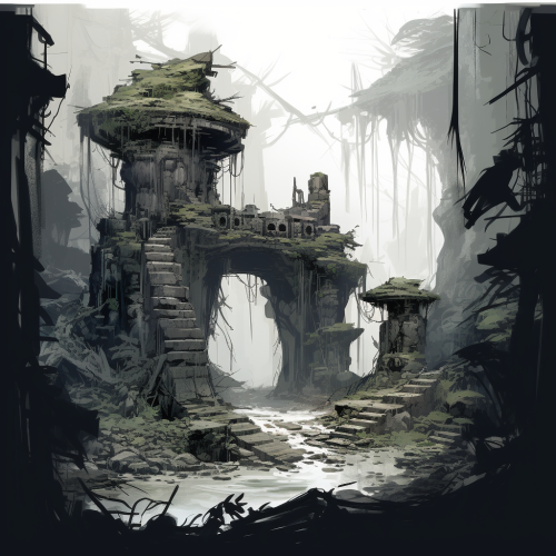 rough sketch, game concept design, ancient chinese, ruins, well, forest, bamboo, spirit