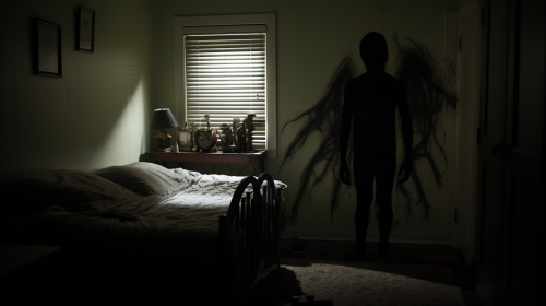 a creepy shadow monster standing in a teenager's room. In the style of david fincher. Dark and moody. Realistic, photoreal, 35mm camera, depth of field. --ar 16:9
