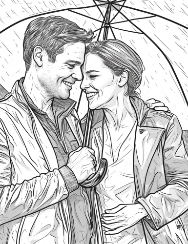Generate a full-page, light grayscale, avoid messy lines, no color, no shadow, no shading color, sturdy strokes, simple line art coloring page featuring an extreme close-up of Chris Pine and Jennifer Lawrence running under the same umbrella. They enjoy each other's smiles. There facial expressions were captured in strong outlines. Draw them with a strong outline to emphasize their importance in the scene. The illustration should be designed to show their intimacy, the happy moment, romantic warmth, and their figures. The visual composition should focus on clean and minimalistic lines that accurately convey the details and intimate emotions of the eyes, faces, body's poses, and ring, capturing the beautiful lines of their arms and fingers. The overall design should be easy to follow, suitable for teens, and allow ample room for creativity and experimentation with colors and shading techniques. Body's sharp line. Vector art. --ar 17:22 --style raw --v 6.0