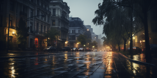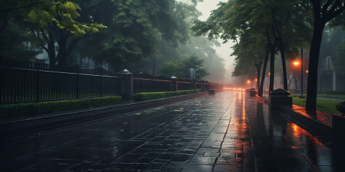 photo quality, real life, city running path in the rain, small city, background --ar 2:1 --v 5.2