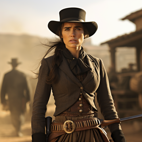 Jennifer Connelly is an outlaw in the Wild West, posing with an 1847 Colt Walker. Ultra-realistic, shot in 8K