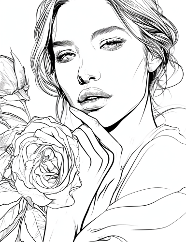 Generate a full-page, light grayscale, simple line art coloring page featuring an extreme close-up of Jennifer Lawrence's face with a blush, lips pursed, and her expression captured in strong outlines. Additionally, there is a man's strong hand gently touching her chin in the composition. In the foreground, ensure the presence of an elegant rose, drawn with a strong outline to emphasize its importance in the scene. The visual composition should focus on clean and minimalistic lines that accurately convey the details and emotions of the subjects. The overall design should be easy to follow, suitable for teens, and allow ample room for creativity and experimentation with colors and shading techniques. No messy lines. No muted hands. Body's sharp line. --ar 17:22 --style raw --v 6.0