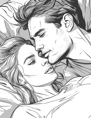 Generate a full-page, light grayscale, avoid messy lines, no color, no shadow, no shading color, no shading lines, no shadow lines, sharp and sturdy strokes, cartoon outline style, simple line art coloring page featuring an extreme close-up of Jennifer Lawrence's face and Henry Cavil's face. Jennifer's face with a blush, lips pursed, and her expression captured in strong outlines. She is lying on huge pillows on the floor. She is looking straight into the camera, happily smiling. One of her hands is wearing an elegant diamond ring. Additionally, Henry Cavil's face shows his admiration for Jennifer's face in the composition; his head is leaning toward her head with a happy face, and his expression is captured in strong outlines. Draw them with a strong outline to emphasize their importance in the scene. The illustration should be designed to show their intimacy, the happy moment, and the diamond ring. The visual composition should focus on clean and minimalistic lines that accurately convey the details and intimate emotions of the eyes, faces, body's poses, and ring.They are wearing T-shirts and jeans. The overall design should be easy to follow, suitable for teens, and allow ample room for creativity and experimentation with colors and shading techniques. Body's sharp line. Vector art. --ar 17:22 --style raw --v 6.0