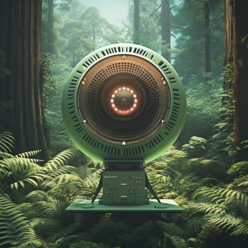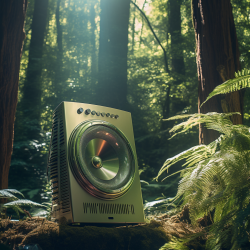 1970s softcover sci-fi style outdoor forest and a large speaker driver, zoomed out, solarpunk