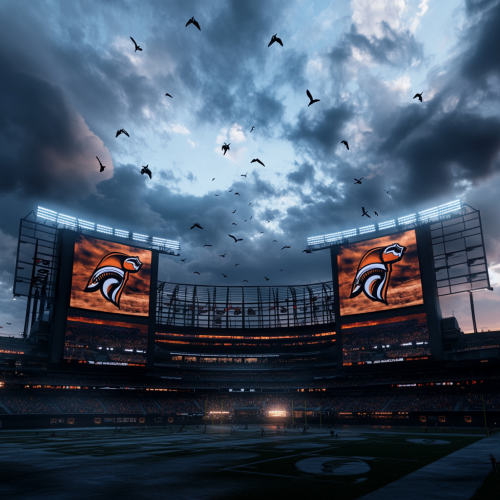 Create an high definition 3d hyperrealistic image that appears to depict Cincinnati Bengals Paycor Stadium prominent structural features and two large screens displaying the logo of the Cincinnati Bengals, a professional American football team. The stadium is illuminated with lights, and the sky above is dark and moody, with clouds and birds flying. The atmosphere suggests a dramatic or intense scene, potentially evoking a sense of anticipation or excitement. The image shows what seems to be an artistic or stylized depiction of a football stadium, specifically associated with the Cincinnati Bengals. The Bengals' logo is prominently displayed on large screens at the stadium's entrance. The sky above is ominous, filled with dark clouds and birds in flight, contributing to a dynamic and somewhat foreboding atmosphere.