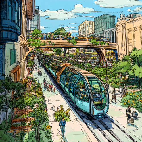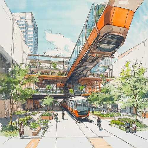it’s 2050 and Cincinnati has expanded its city with technology and innovative design. There is a solarpunk theme featuring an adaptive reuse public transport such as a road or bridge turned into a monorail or bike path. Heavily reduce cars and put emphasis on less traffic. The hub station for this monorail enters into a building, surrounded inside by community gardens, local markets and retail. It is a community space where you can rent other mobile devices. Do this in a sketched style.