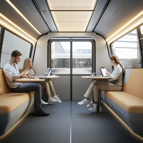 personalized seating to customize aumbiance and privacy for individual users and optimize work with swivel seating and tables in the interior layout of a monorail